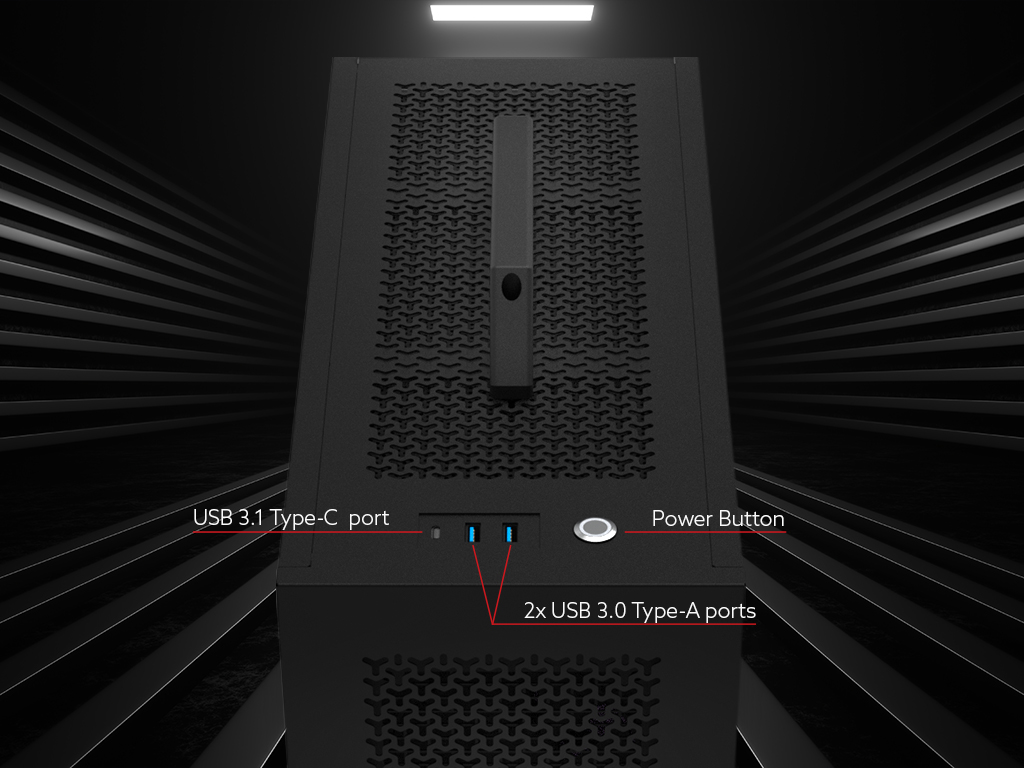All the M-Class case options offer multiple I/O ports including USB 3.0 ports, USB 3.1 Type-C port, and a power button. Different motherboard options are available which come with varying amounts of I/O ports such as more USB ports, audio, and more.